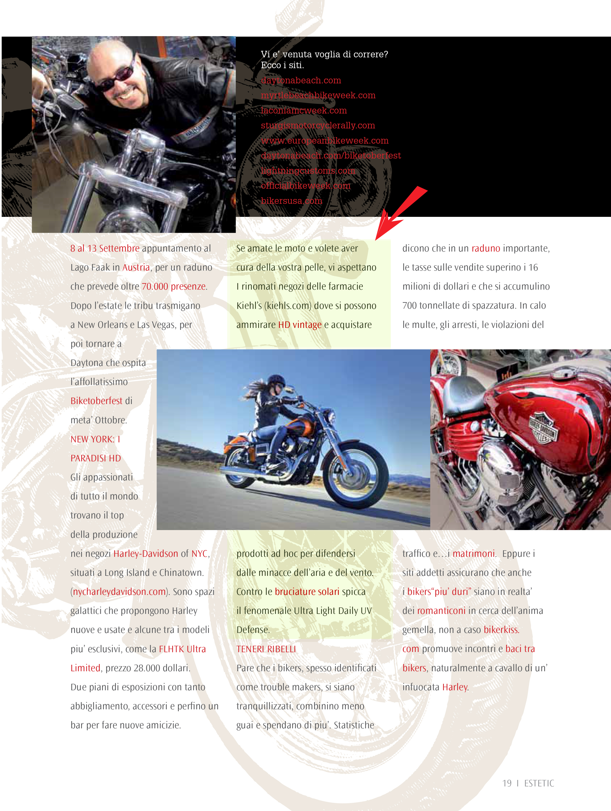Pare che i bikers, spesso identificati come bad boys, si siano tranquillizzati, combinino meno guai e spendano di piu’. Statistiche dicono che, in un raduno importante, le tasse sulle vendite superino i 16 milioni di dollari e che si accumulino 700 tonnellate di spazzatura. In calo le multe, gli arresti, le violazioni del traffico e…i matrimoni. Eppure i siti addetti assicurano che i bikers“piu’ duri” siano in realta’ dei romanticoni in cerca dell’anima gemella, non a caso bikerkiss.com promuove incontri e baci tra bikers, naturalmente a cavallo di un’ infuocata Harley.