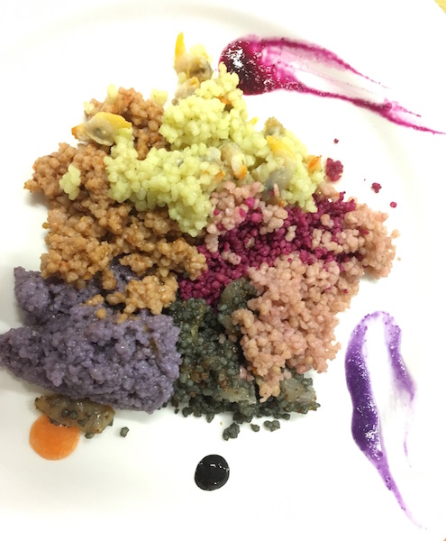Grand finale with a local idol: the native starred Chef Igles Corelli. His dish was a colorful bonanza of couscous, all cooked with different vegetables such as carrots, aloe vera, cabbage, etc. A carnivalesque dish that reminded me of the Missoni fabrics, the Gustav Klimt palette and those Pollock brush strokes. The taste? a Carnival joke!