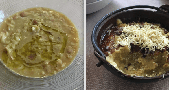 bean, very tender, with an almost inconsistent skin after cooking, whose cultivation is documented since early twentieth century) and onion sorbet in saor (literally “flavor”, a typical Venetian condiment made from onions, vinegar, raisins and pine nuts). Simone continued with a Vialone rice creamed with a 48-month matured cheese from the Corrado Benedetti reserve, chestnuts from San Zeno, suckling pig and cabbage.