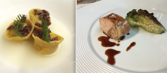 Then Stefano’s signature dish , the Faraona in Tre Servizi (first, the clarified guinea-fowl broth is served, then the breast stuffed with walnuts and plums and wrapped with bacon.