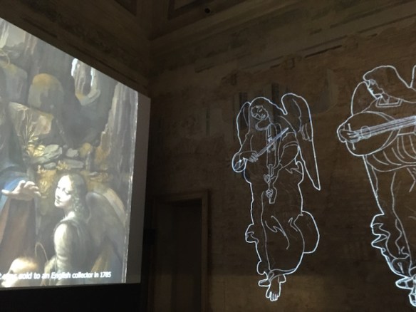 Leonardo and Milan, The Virgin of the Rocks and the Last Supper, Leonardo and the other works and finally Leonardo’s Signature, taking place at the height of an almost dreamlike, immersive  narration: the spectator is at the center of a loggia delimited by large arches and closed by curtains moved by the wind.