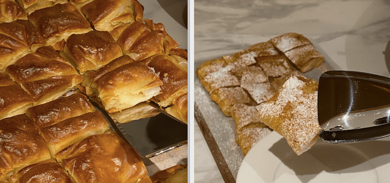 Add seasoning of any kind, sweet and salted delicacies, fruits and tasty local pastry, such as bougatsa a greek pie with a creamy custard and light phyllo, and the incomparable cheese pie called tiropita… in short: a king’s breakfast!