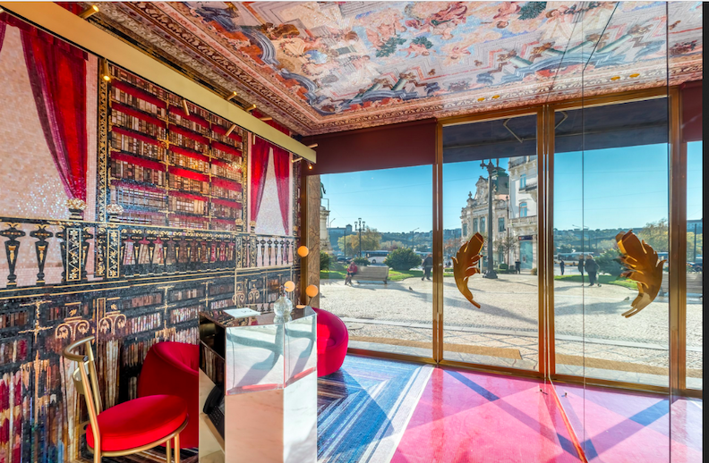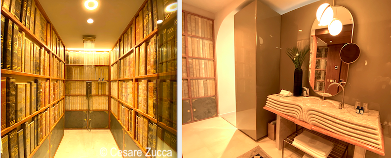 The reception looks like a dazzling library made with more than 400,000 mosaic tiles, a tribute by Hästens Sleep SPA to the Joanina Library