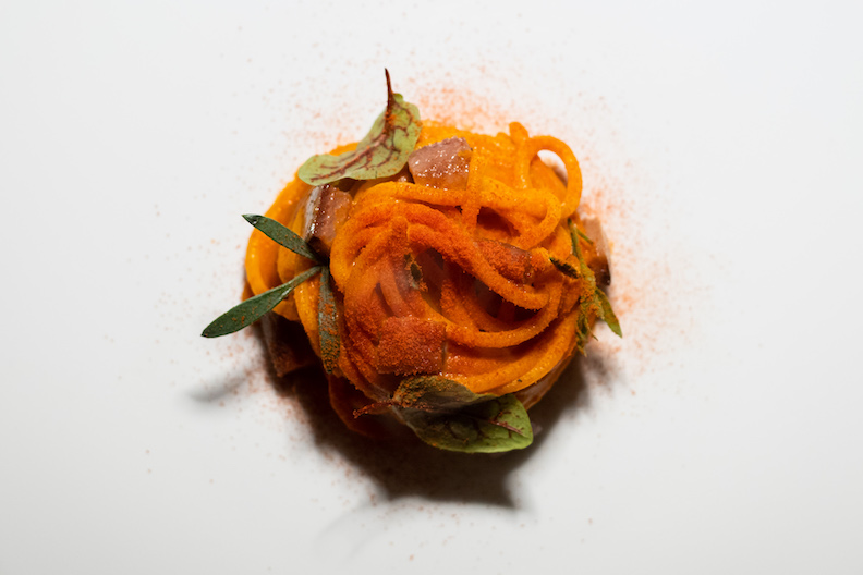 Spaghettone alla crema di peperone, polvere di pomodoro e sardina che è un pilastro della cucina locale: un pesce azzurro, ricco di Omega 3. Le sardine sono economiche, sostenibili e hanno bassi livelli di mercurio, mentre lo spaghettone lavorato a mano, rappresenta un’eccellenza italiana gestito dalla famiglia Zampino