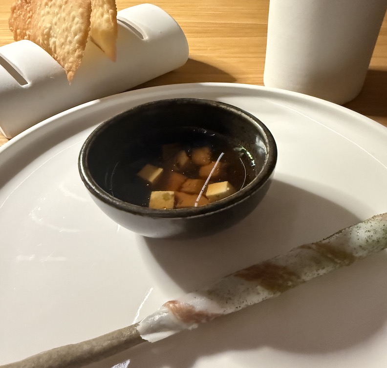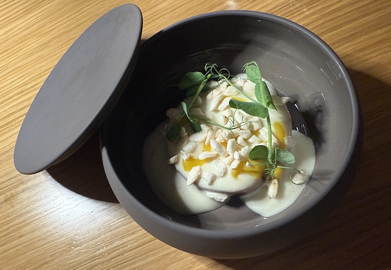To start, the chef suggested a small bowl of miso soup with cardoncelli mushrooms, seaweed, and fresh primo sale cheese, served with an unusual selection of accompaniments: burnt-wheat grissini with lardo, onion crackers, flaky bread with salted butter, and the wonderful Pane di Troia, all paired with Roccia olive oil (Coratina and Peranzana).