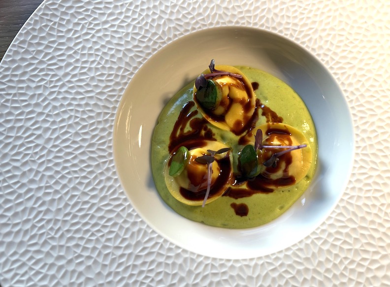 Among the first courses, an intriguing burnt-wheat tortello filled with braised meat, Podolica caciocavallo foam, wild fennel oil, and pork popcorn. Seafood makes its appearance as well, with tortelli stuffed with lobster and lime, served with a zucchini zabaglione.