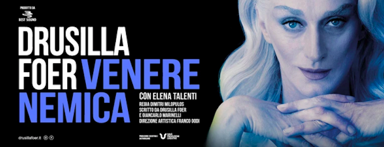 Written by Drusilla Foer, Venere Nemica reinterprets the myth in a crisp, funny, and moving way, poised between tragedy and comedy, bringing the great themes of the classic to contemporary life: the competition between mothers-in-law and daughters-in-law, fading beauty, maternal possessiveness over their children, and the age-old conflict between men and Gods. The archetypes explored in the play prove disarmingly relevant, made even more evident by the performer’s strong personality shining through in the role of the Goddess, now living among mortal humans.