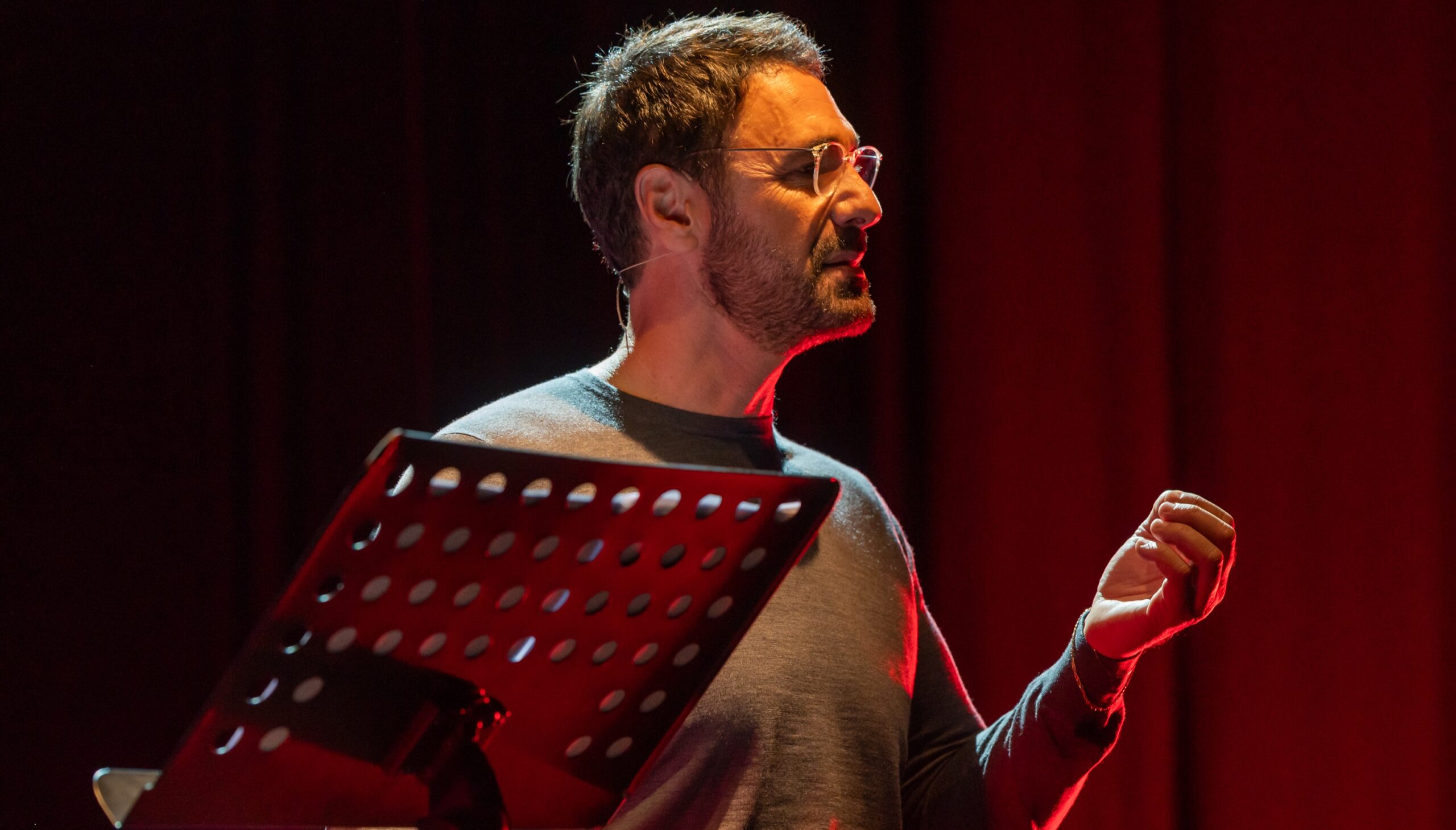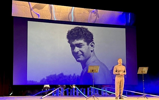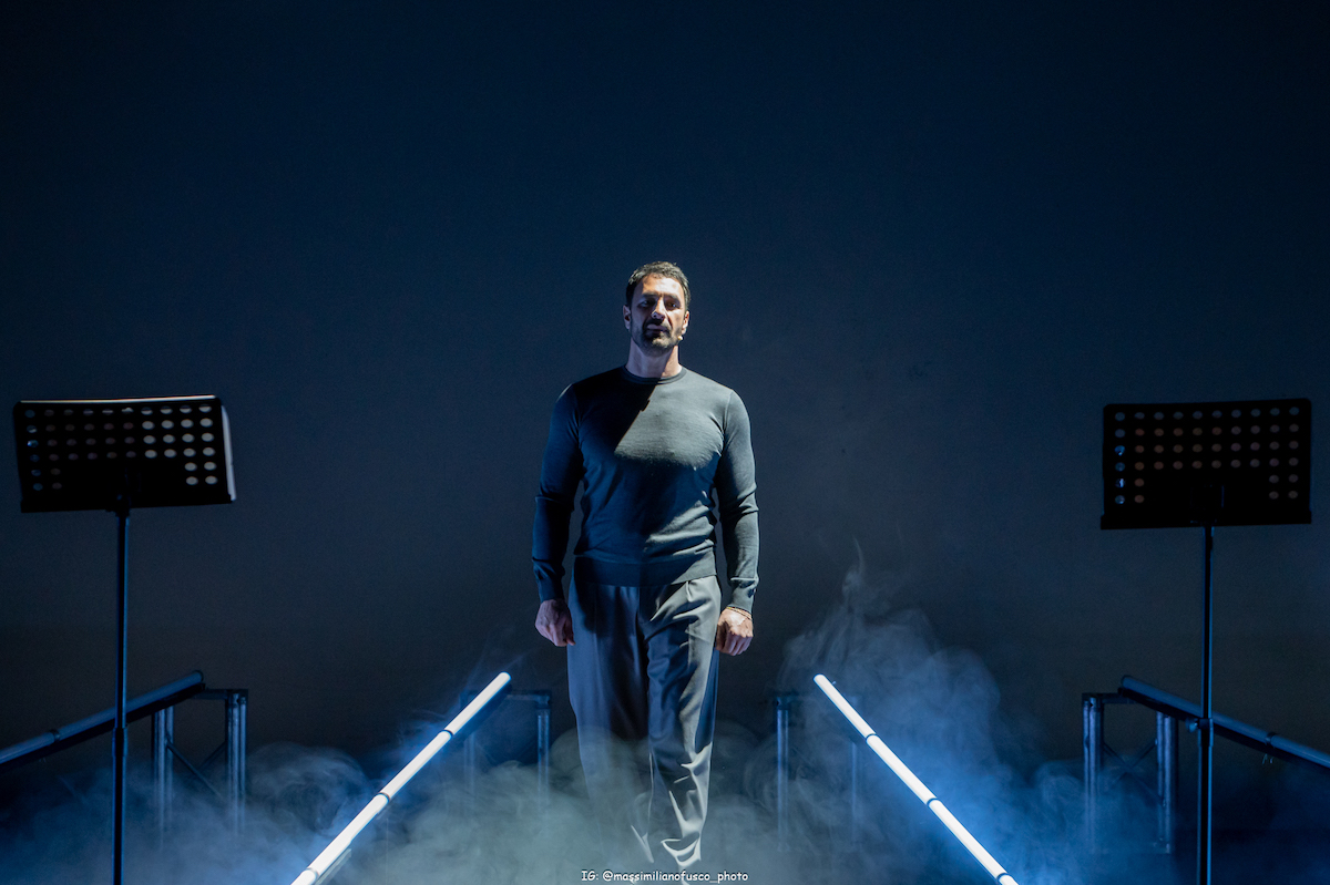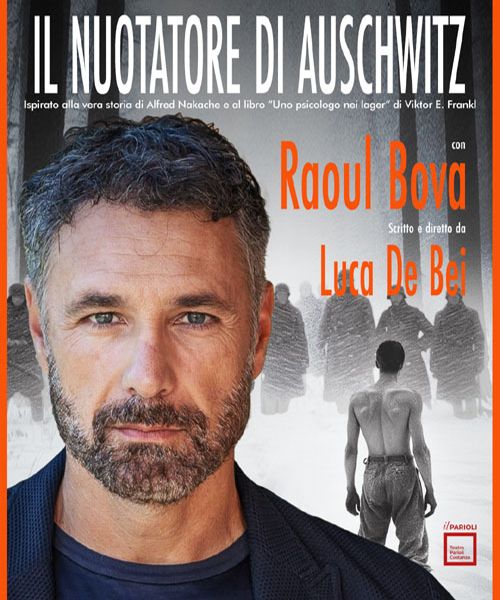 Raoul Bova acts as an intermediary to tell the story of the famous French swimmer Alfred Nakache and the Austrian psychoanalyst Viktor Frankl, both locked up in Auschwitz. Raoul dialogues with the audience, also strong in his own experiences as an athlete, bringing his own sensitivity and his own experience to the story. The scene around him becomes essential, composed mainly of lines of lights designed by Marco Laudando and which become the symbol of lanes in a swimming pool, of rails that transport souls full of pain to finally rise to perspective escapes in a tension towards the unknown, the absolute, the search for a spirituality more necessary than ever in an attempt to survive the brutality of the concentration camp. The scene is then enriched by images filmed by Marco Renda that immerse the spectator in abstract yet material and poetic spaces, in an essential black and white, non-places that are mirrors of the soul. Again, the show makes use of the original music by Francesco Bova that builds sound carpets rich in throbs and references, that envelop and sometimes disorientate the spectators, but always with the intent to involve and excite. Because, if the story of an Auschwitz inmate inevitably brings us back to the many testimonies heard up to now, it is true that that of the swimmer Nakache stands out from these to become especially the emblem of a resistance carried forward and achieved with courage and stubbornness. A figure who, to fully emerge, however, needs his “double” – the scholar Frankl, – who analyses and theorises what the instinctive Alfred instinctively puts into action. In this vision Alfred and Viktor are each other’s mirror, they are two sides of the same coin and they merge in an experience capable of giving spectators the ultimate meaning of existence.