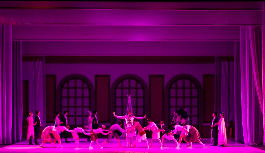 In this version the action takes place in a 1920s atmosphere. The arrival of Christmas is celebrated on stage and the guests, surprisingly, reach the stage from the audience. COLORS!