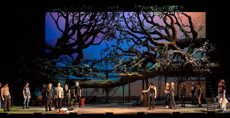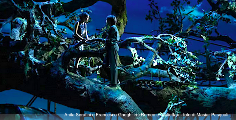 It’s a contemporary story of a sudden love,, a story of two teenagers, made even stronger by adversity, eager only to break down any obstacle to its own realisation.. The scenography is a sort of tree that crosses the stage and on which the actors move, suspended as if on the branches of a forest, while the ground takes us to an urban suburb, perfect scenario for the fightings between metropolitan gangs.