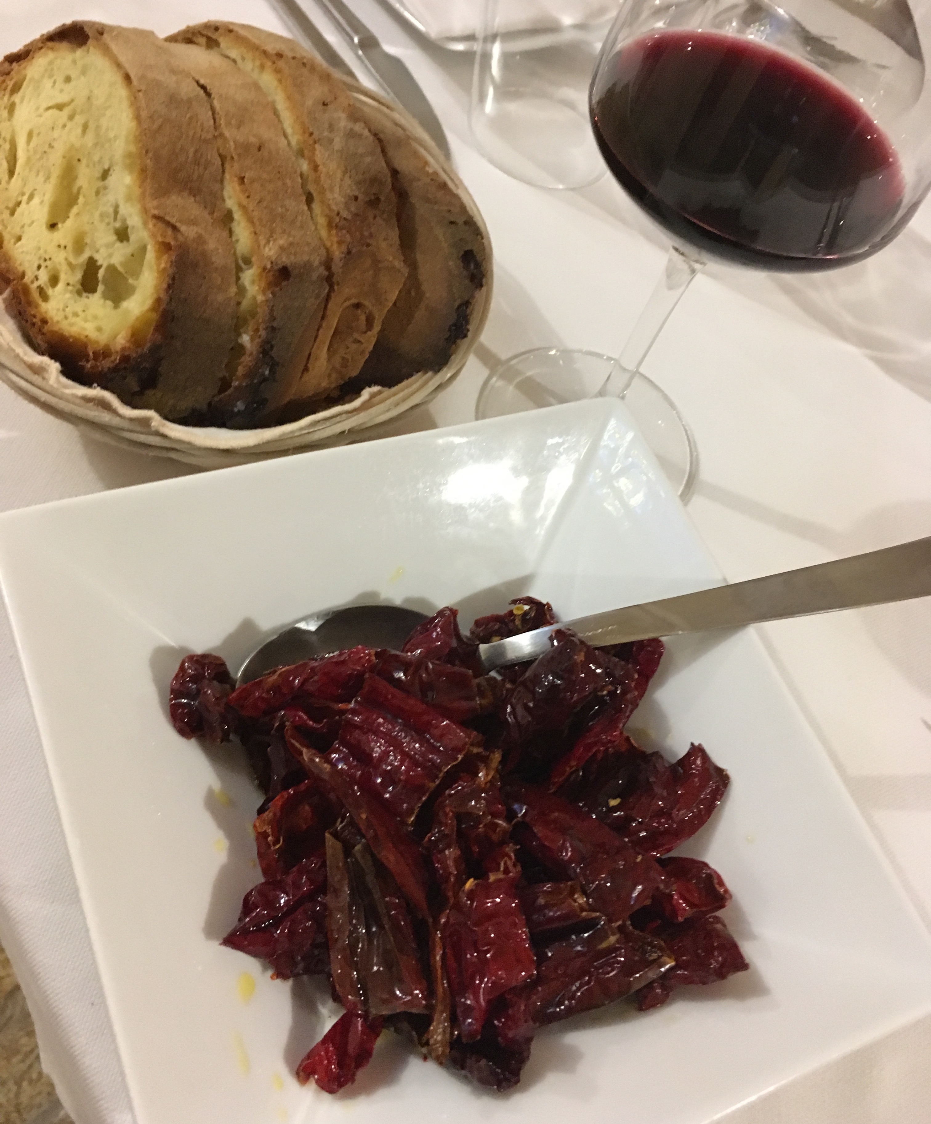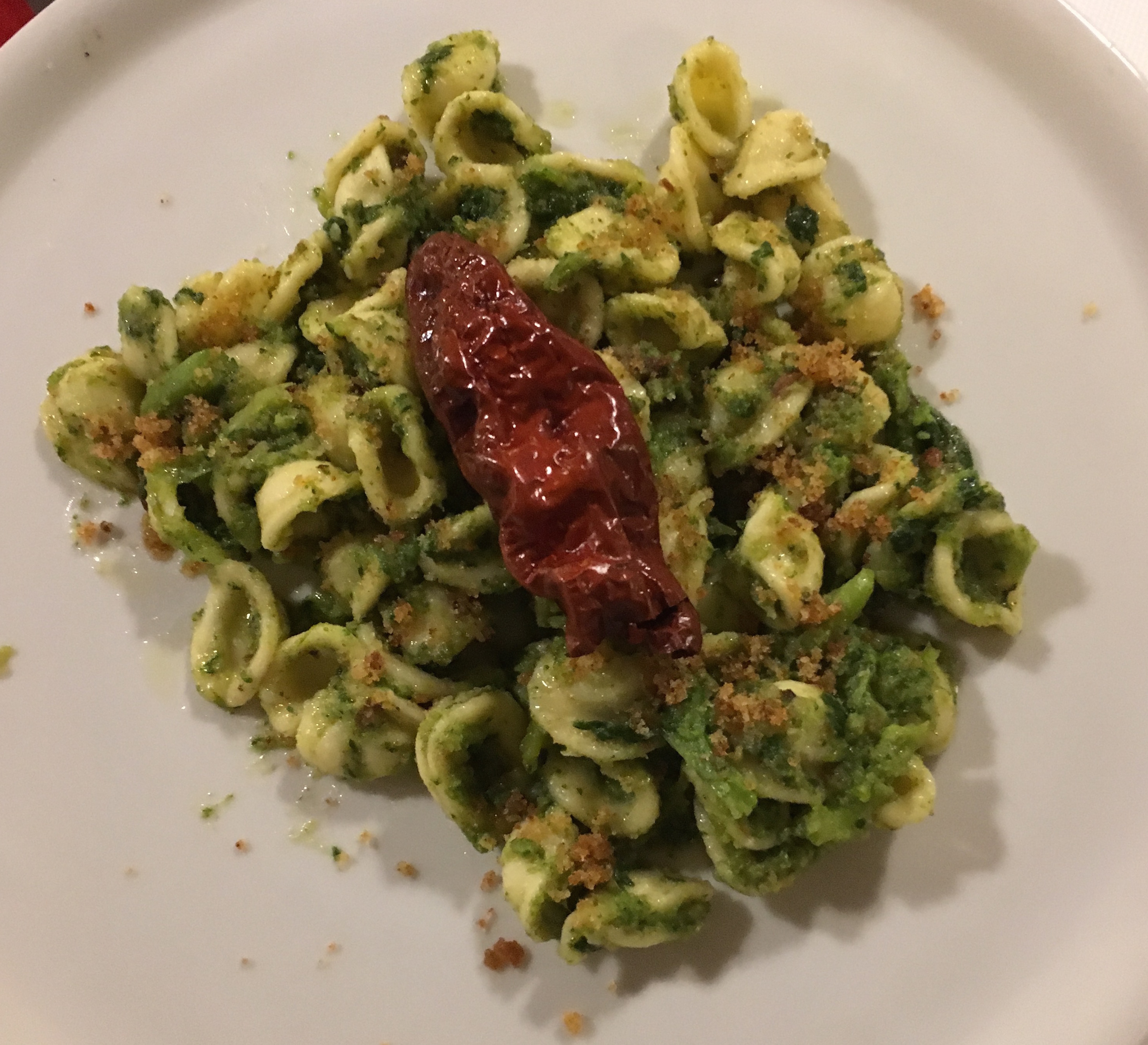 I went there for lunch and followed Anna’s suggestions, starting with a tasty orecchiette alle rape with anchovies and toasted breadcrumbs, then I tried home made strascinati pasta with cardoncelli mushrooms and garnished with the typical crunchy peperone crusco, fried red pepper.