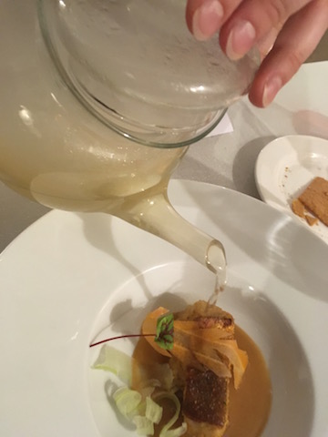Starting with super crunchy chips of red peppers, followed by fagots of ziti with cream of yellow and red peppers, bundled in a slice of sweet scamorza cheese topped by goat ricotta curlS.