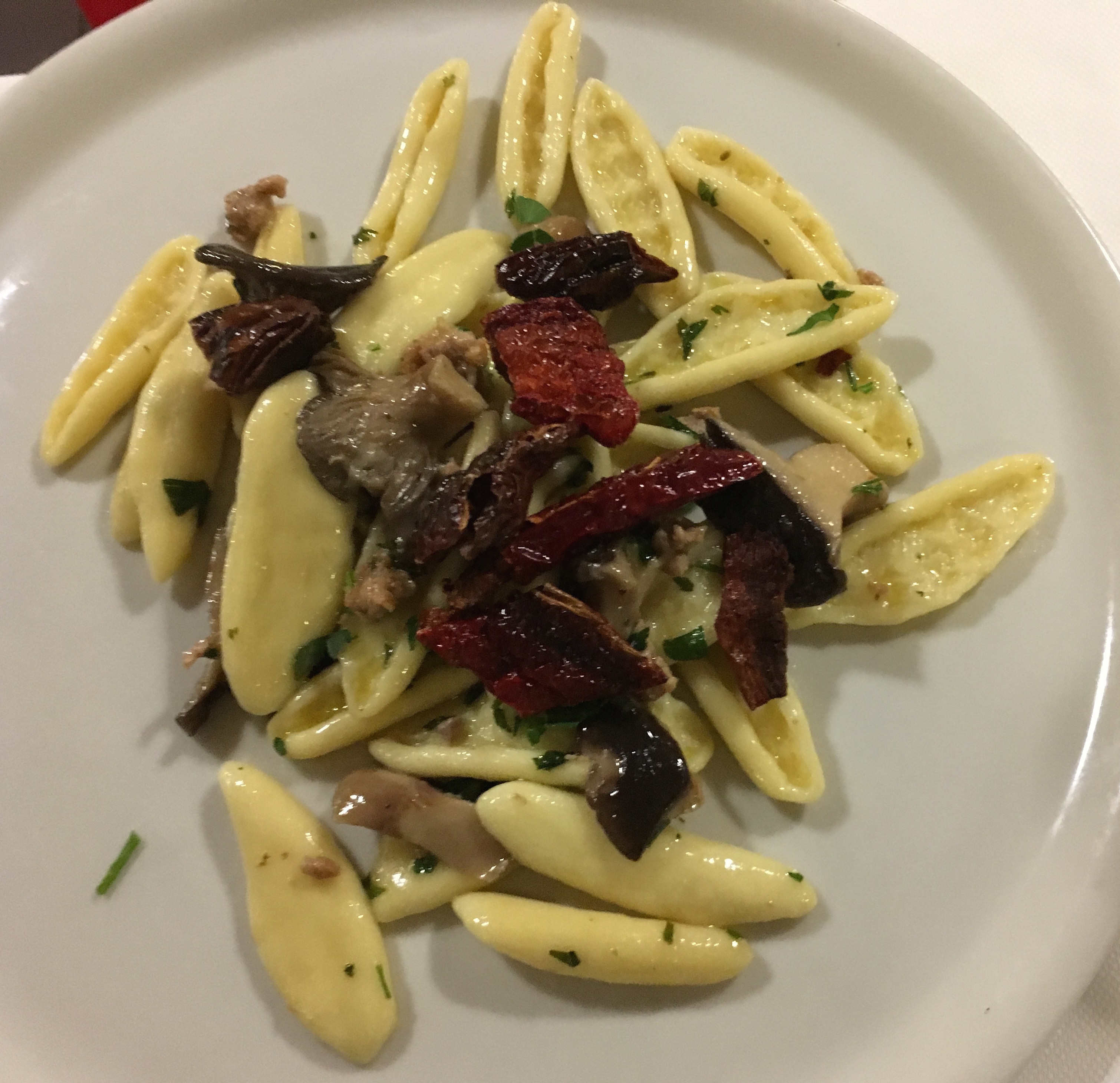 I went there for lunch and followed Anna’s suggestions, starting with a tasty orecchiette alle rape with anchovies and toasted breadcrumbs, then I tried home made strascinati pasta with cardoncelli mushrooms and garnished with the typical crunchy peperone crusco, fried red pepper.