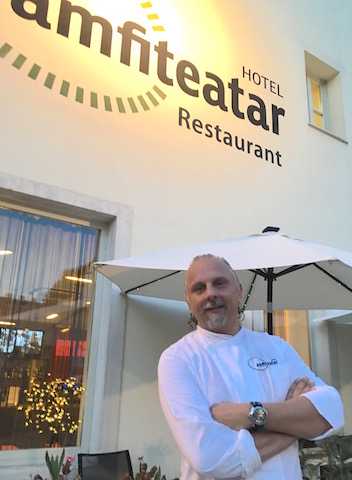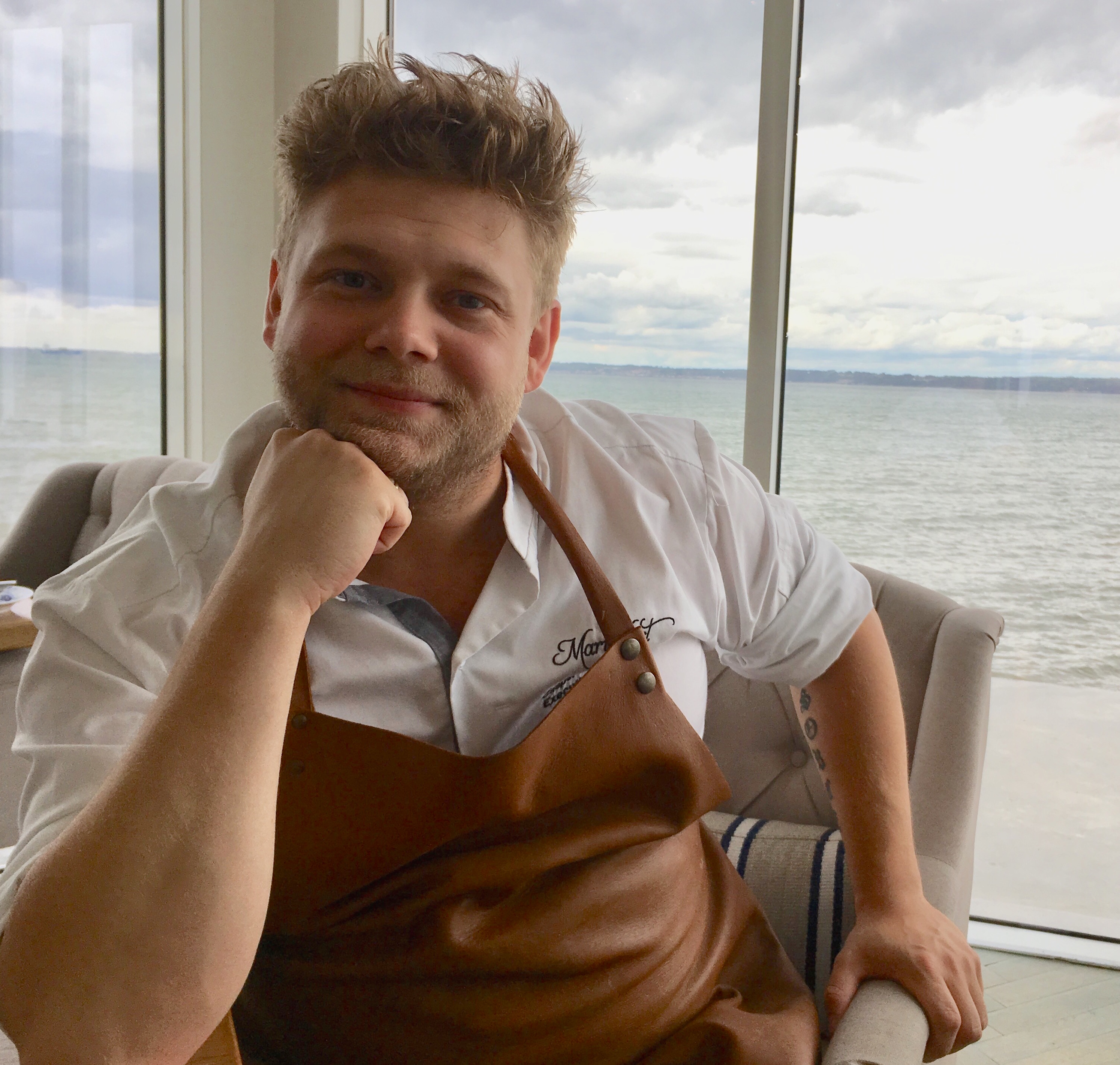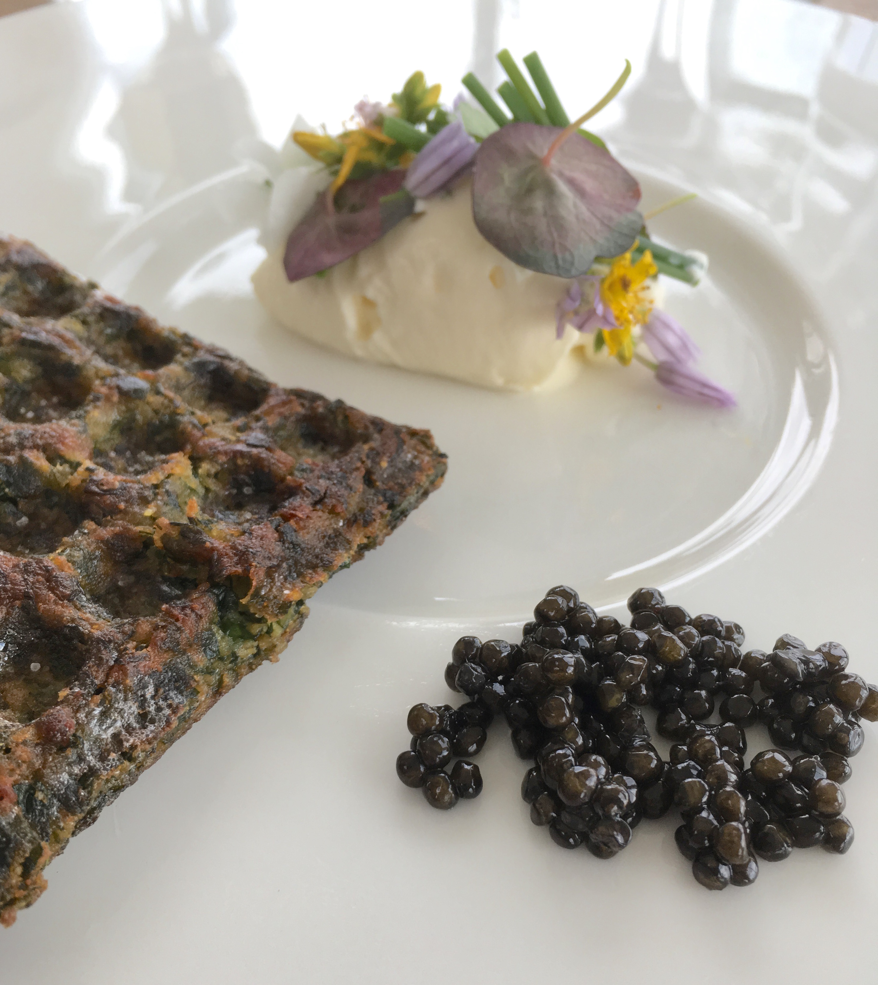 They called him ‘the king of herbs ‘for his passion for vegetables and fresh products from the field. His passions are: fish, molluscs, entrails as lamb’s brain, (not so popular in the quite skeptic Northern Europe), He started with French cuisine, passed to the molecular and ended up with mixing them two styles. ‘I like to play with the ingredients, says Casper, like for example, pairing strawberries to balsamic vinegar. I worked in Danmark a lot, including the Copenhagen National Library. I got good reviews and I started my new adventure here at Marienlyst Hotel, In my my fridge at home, there is always place for eggs, probably because my wife loves them, lot of vegetables and of course several max sizei Pepsi. I Love Pepsi… ‘His friendly Verona born partner Fabio Ciccarelli started serving a surprising appetizer: a revolutionary version of the traditional blini, made with caviar white sturgeon, to be mixed to crème fraiche on herbal waffle. The ingredients just melt perfectly together.