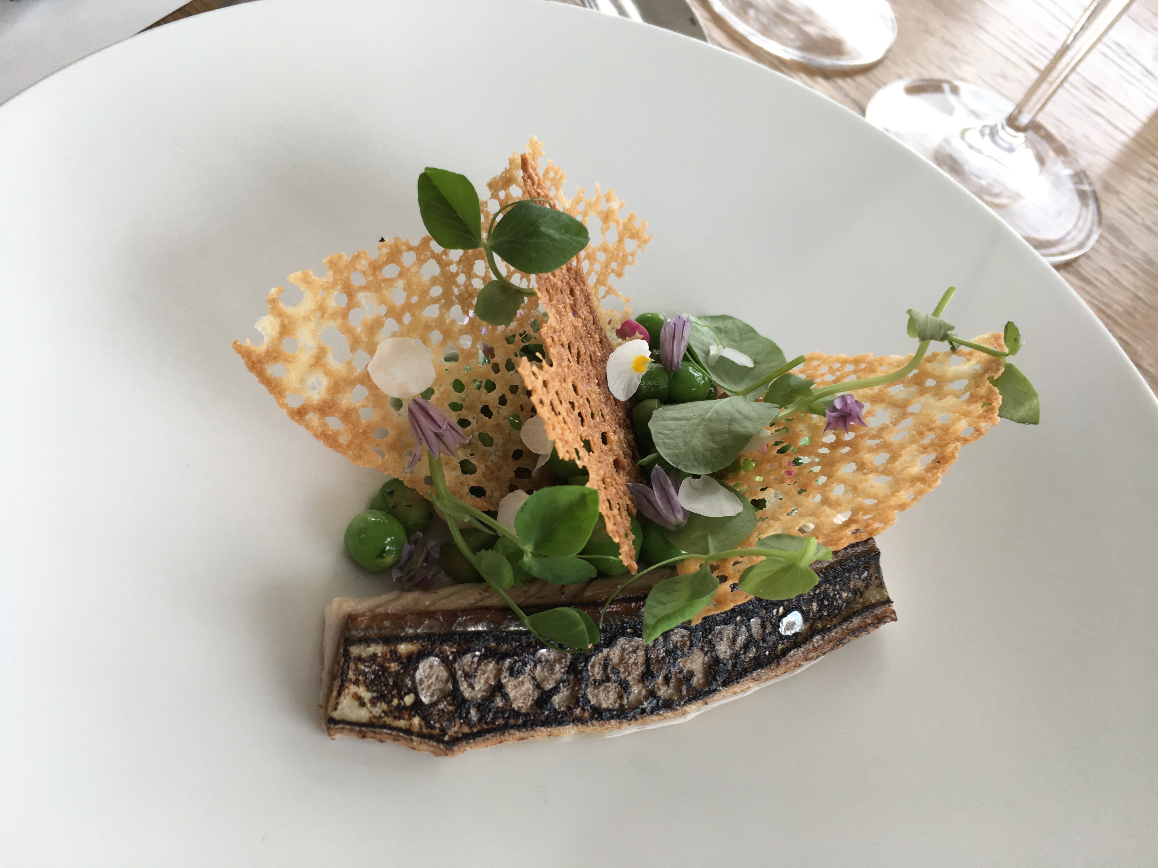 Then a salted unusually cooked burned salmon, followed by a mackerel with foie gras, green peas. As a main dish , I tasted halibut with asparagus that burned for few minutes to maintain the crunchiness.