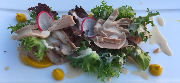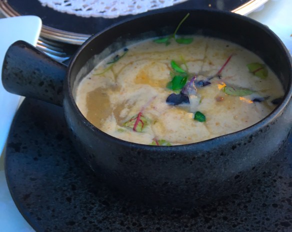 The mise en bouche consisting of a delicately baked oyster and a buttery giant shrimp had all the signs of what you can expect in a palace restaurant: prime quality ingredients simply treated. This seafood opening was in synch with the view of the water even though it wasn’t the sea. As I were to learn later by the chef, unfortunately, as beautiful as it is, the lake doesn’t often yield the quantity of fish needed to take place on the menu.