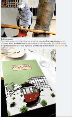 Lisbona: oggi vera giornata ‘turismo e gusto’.Mariana Marques, deliziosa PR del J A Grupo, mi guiderà in un viaggio-gourmet per scoprire i tesori di José Avillez, uno tra gli chef più famosi del Portogallo, gestisce 12 ristoranti, produce vini, ha partecipato a moltI show radiofonici e televisivi. Prima tappa Belcanto, premiato con due stelle Michelin. Raffinata cucina portoghese sofisticamente rivisitata. Tra le specialità il decennale mergulho no mar, spigola con alghe e vongole e il tradizionale cocido à la Portuguesa, sensazionale bollito misto di verdure e carni, tra cui la classica salsiccia chouriço de sangue. Proseguo verso Cantinho do Avillez, presente anche a Porto, poi Mini Bar, nell’interno del Teatro de São Luiz, con un menu perfetto per prima e dopo lo spettacolo e Pizzaria Lisboa, omaggio all’Italia e alla pizza, uno dei piatti preferiti da José. Dopo una bella camminata, sosta lunch al Café Lisboa nel suggestivo Largo de São Carlos. Il menu cita e reinterpreta la più storica cucina portoghese, come la portuguesinha, qui proposta con una sfoglia ripiena di carne e cavoli.