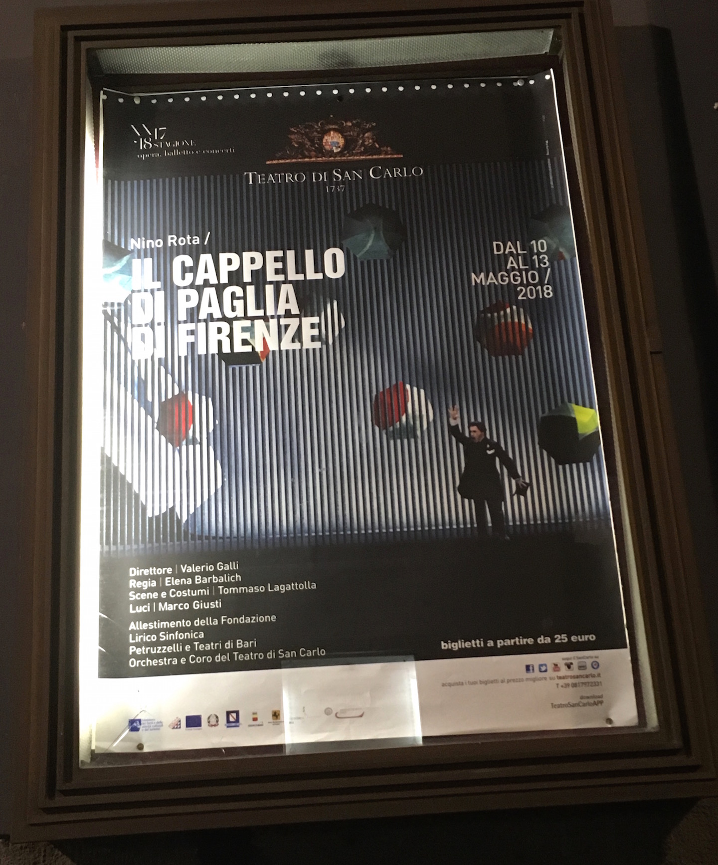 Last night, the beautiful San Carlo Theatre in Naples, hosted the première of Il Cappello di paglia di Firenze (The Straw Hat of Florence) an alive, surprising and amusing musical farce based on the vaudeville Le Châpeau de paille d’Italie by Eugène Labiche and Marc Michel, with the music of the great composer Nino Rota who also wrote the libretto helped with his mother Ernesta Rinaldi. This little jewel, that echoes opera, operetta, musical theatre and contemporary sounds, was welcomed by a resounding success that led to a very unusual circuit in Italy, initially performed in the 50’s at the Piccola Scala in Milan under the direction of Giorgio Strehler.