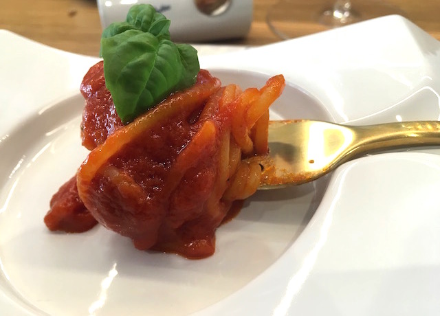 First, the quality of the ingredients. Well, we do not have to go very far with that: durum wheat and water, that’s it. I had been told that the quality of the water was important, but Gianluigi Peduzzi – co-owner of Rustichella with his sister Stefania – seemed to dismiss that element. Just pure water. The ingredient that really counts is the durum wheat. The siblings being children of famous millers in the region of Vestina knew one thing or two about the ingredient! A great wheat will lend not only great flavor, but great texture. Whether imported or locally sourced, only the best quality is used. An organic line of pasta has also been created recently