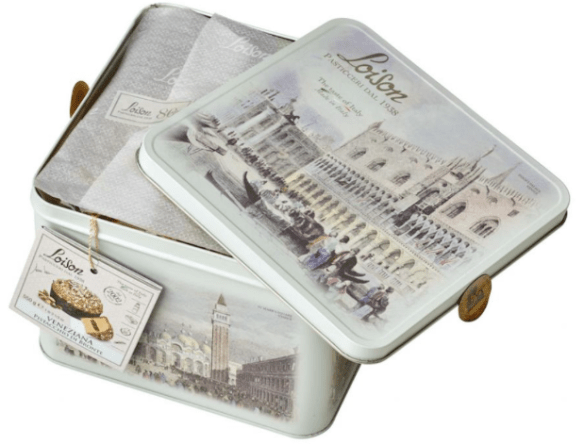The amazing packaging, signed “Sonia Design” showing off images of the lagoon atmosphere, of magnificent traditions and magnificent architecture, taken from ancient postcards kept at the Loison Museum.